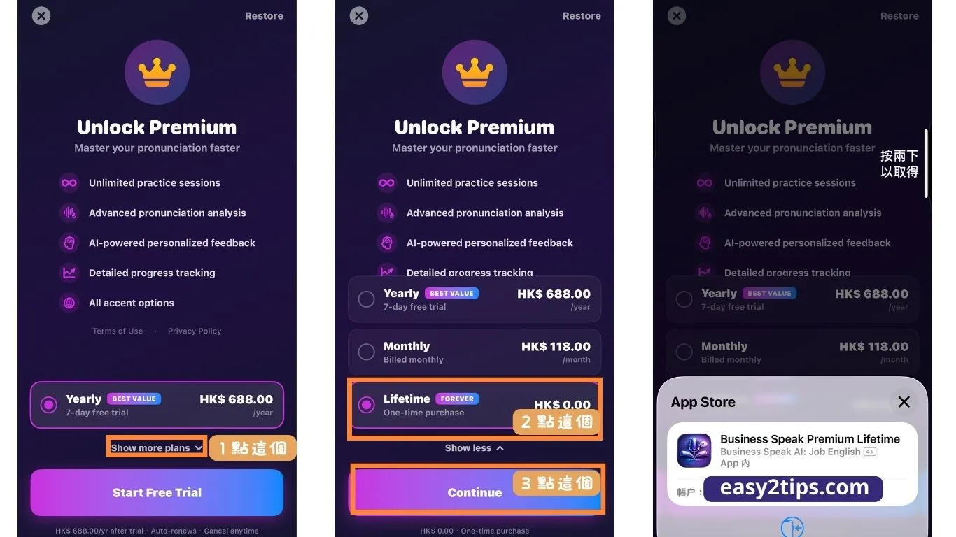 3. 找到「終身會員」升級選項:接著會看到付款選項頁面,按「顯示更多」,如果看到「終身」價格顯示為 $0,點擊這個選項並按「繼續」,透過 Apple ID 認證即可免費獲得。