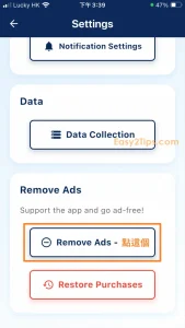 只要下載並打開 App,之後點擊右下方的「More」,再按「Settings」,往下會看到「Remove Ads」的選項, 點擊這個選項,透過 Apple ID 認證即可免費獲得。