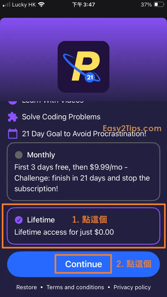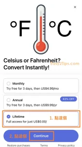 只要下載並打開 App,然後完成一些基本設置後,接著會看到付款選項頁面。如果看到「Lifetime」價格顯示為 $0,點擊這個選項並按「Continue」,透過 Apple ID 認證即可免費獲得。
