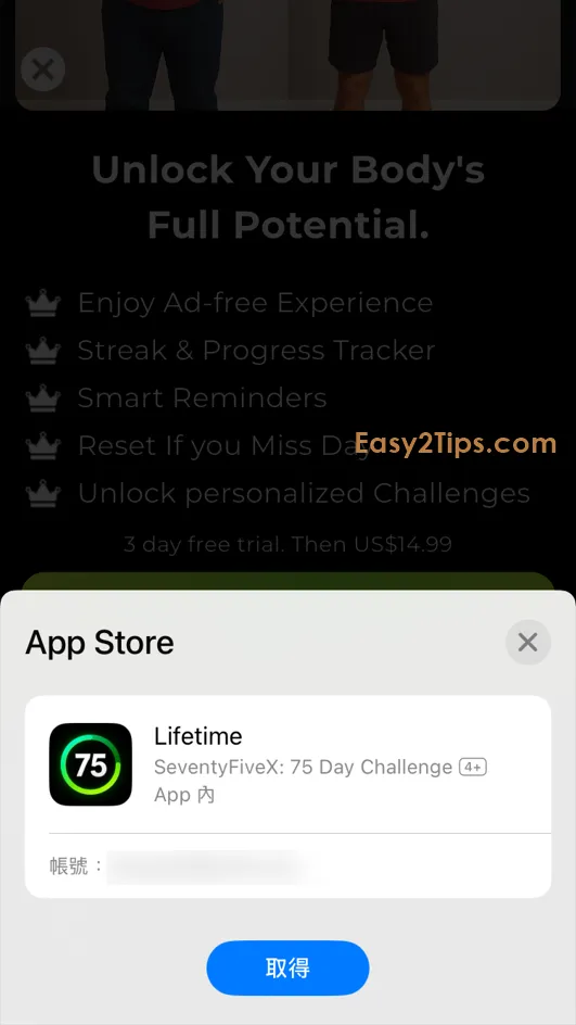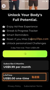 只要下載並打開 App,然後完成一些基本設置後,接著會看到付款選項頁面。如果看到「Lifetime」價格顯示為 $0,點擊這個選項,透過 Apple ID 認證即可免費獲得。