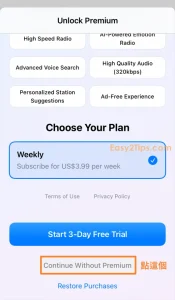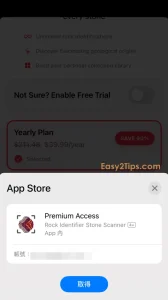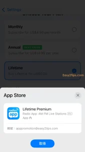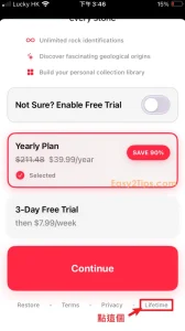 只要下載並打開 App,然後完成一些基本設置後,接著會看到付款選項頁面。點擊下方的「Lifetime」,透過 Apple ID 認證即可免費獲得。