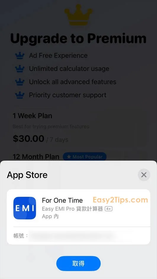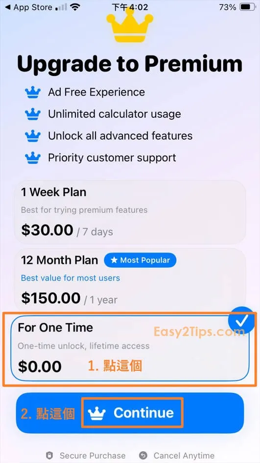只要下載並打開 App,然後完成一些基本設置後,接著會看到付款選項頁面。如果看到「For One Time」價格顯示為 $0,點擊此選項並按「Continue」,透過 Apple ID 認證即可免費獲得。