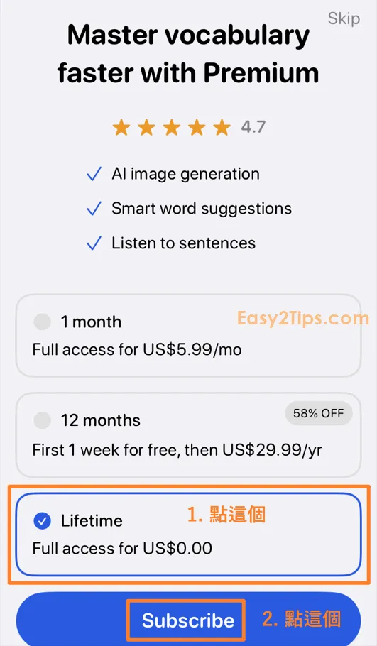 只要下載並打開 App,然後完成一些基本設置後,接著會看到付款選項頁面。如果看到「Lifetime」價格顯示為 $0,點擊此選項並按「Subscribe」,透過 Apple ID 認證即可免費獲得。