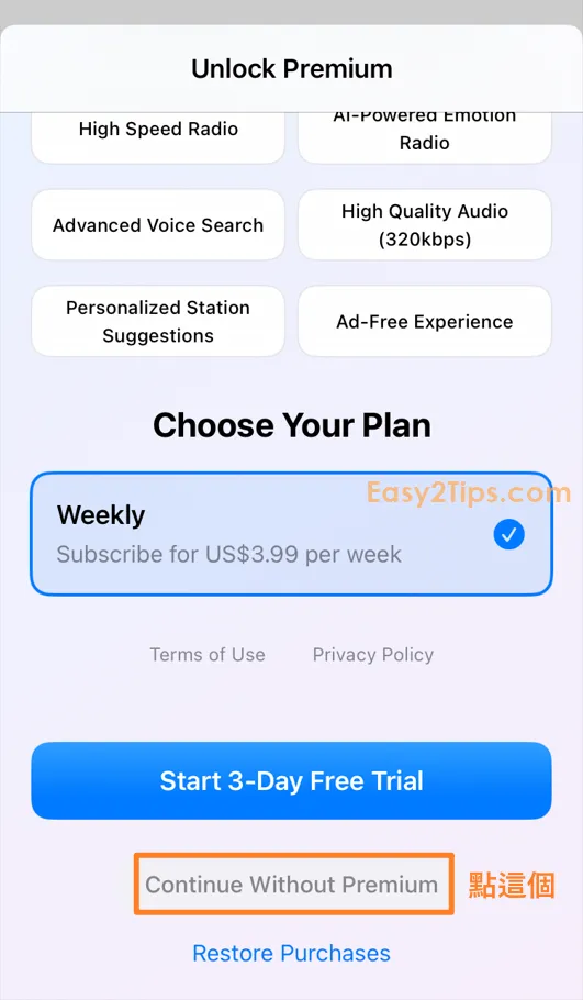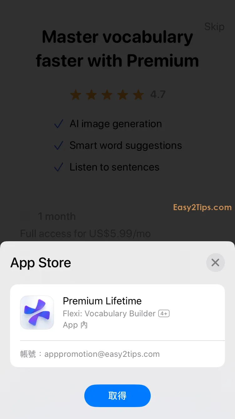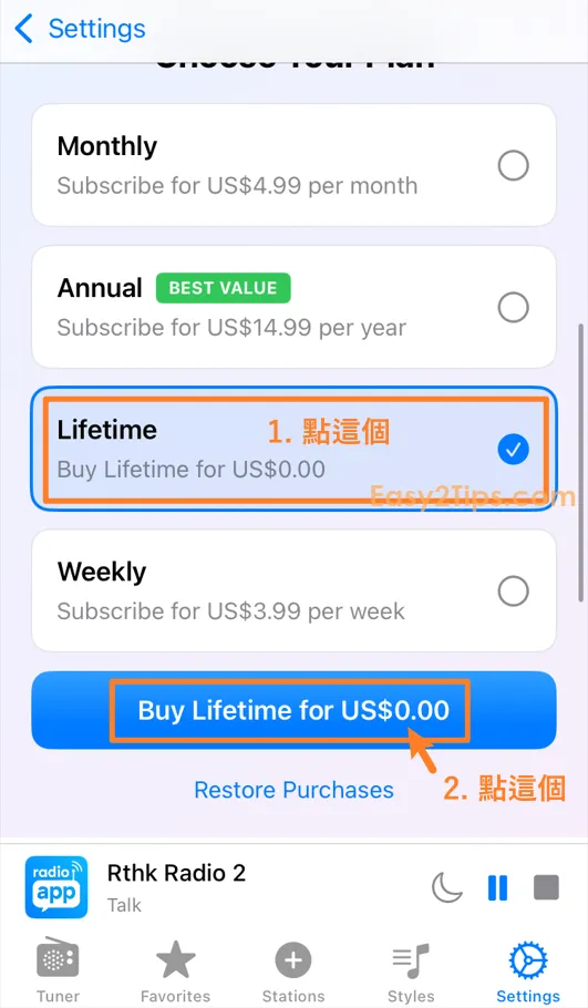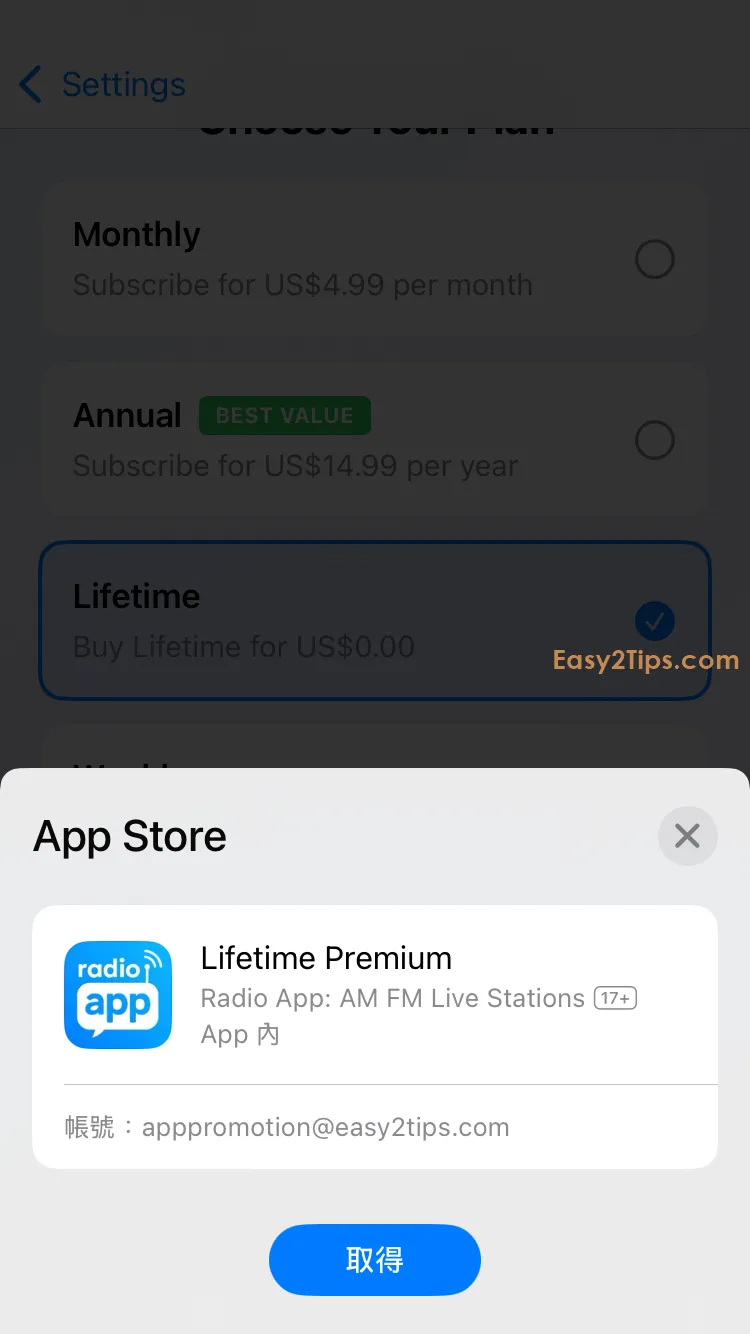 只要下載並打開 App,然後完成一些基本設置後,接著會看到付款選項頁面。點擊下方的「Lifetime」,透過 Apple ID 認證即可免費獲得。