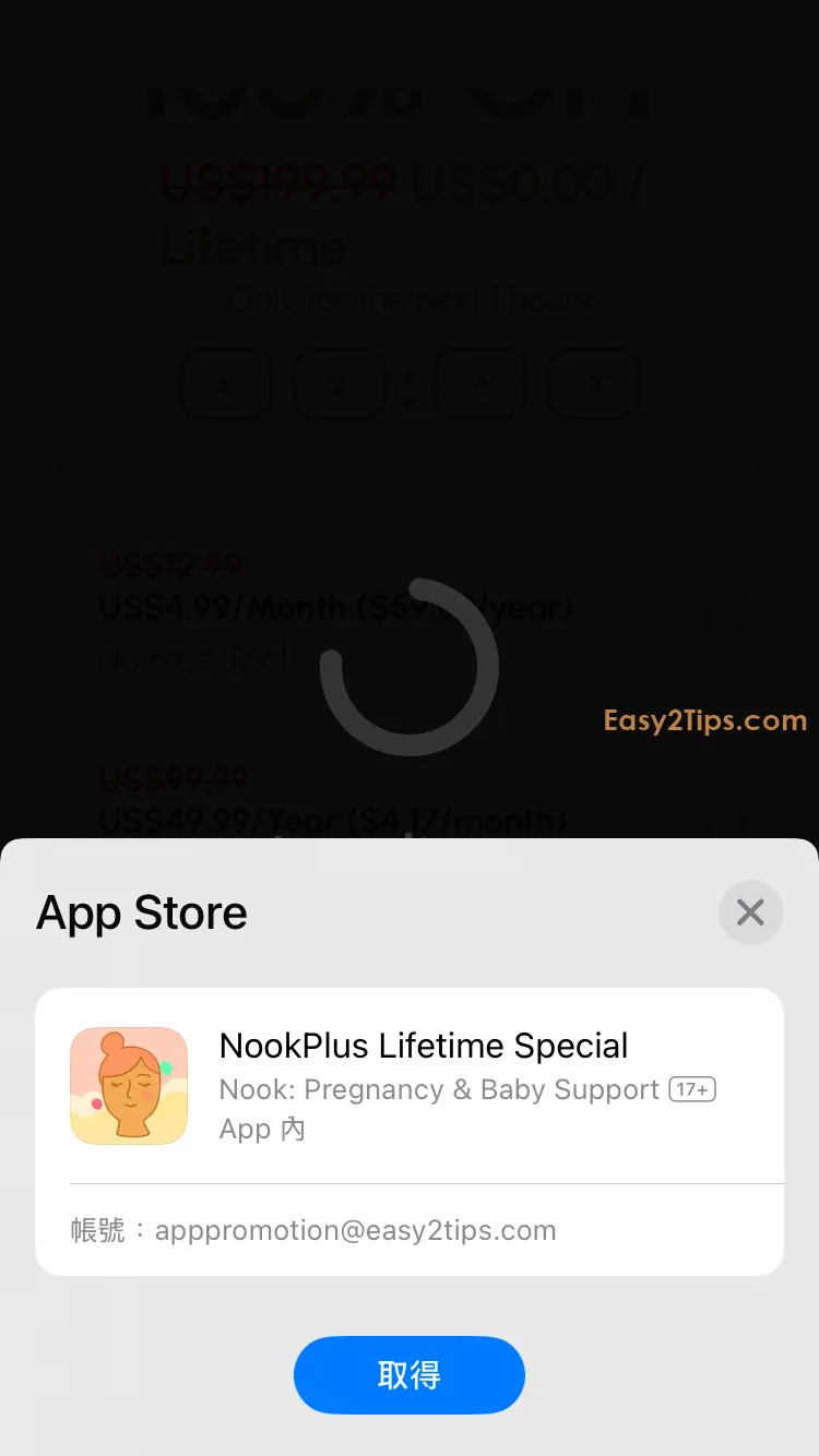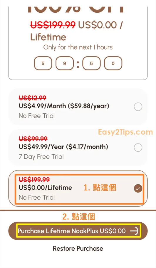只要下載並打開 App,然後完成一些基本設置後,接著會看到付款選項頁面。如果看到「Lifetime」價格顯示為 $0,點擊此選項並按「Purchase Lifetime NookPlus $0」,透過 Apple ID 認證即可免費獲得。