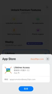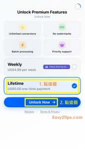 只要下載並打開 App,然後完成一些基本設置後,接著會看到付款選項頁面。如果看到「Lifetime」價格顯示為 $0,點擊此選項並按「Unlock Now」,透過 Apple ID 認證即可免費獲得。