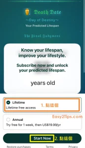 只要下載並打開 App,然後完成一些基本設置及問答 (35題),接著會看到付款選項頁面。如果看到「Lifetime」價格顯示為 $0,點擊此選項並按「Start Now」,透過 Apple ID 認證即可免費獲得。