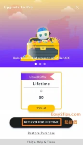 只要下載並打開 App,然後完成一些基本設置後,接著會看到付款選項頁面。如果看到「Lifetime」價格顯示為 $0,點擊此選項並按「GET PRO FOR LIFETIME」,透過 Apple ID 認證即可免費獲得。