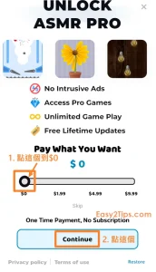 只要下載並打開 App,接著會看到付款選項頁面。將選項移動到價格為 $0,再按「Continue」,透過 Apple ID 認證即可免費獲得。
