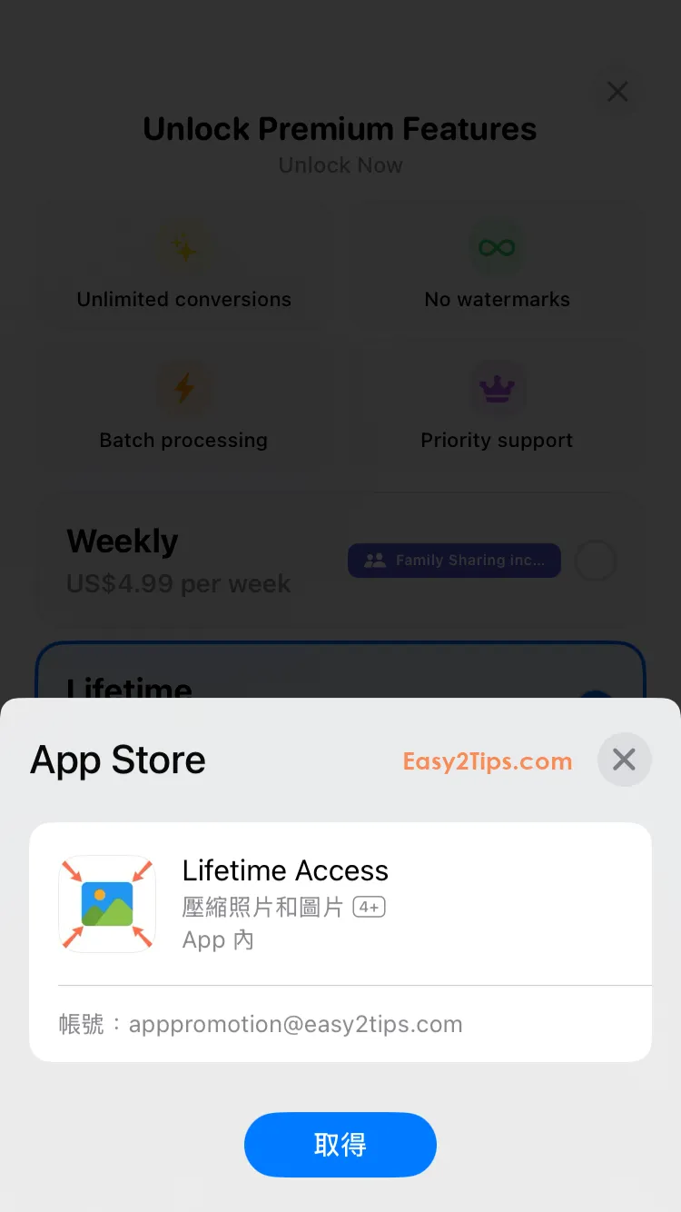 只要下載並打開 App,然後完成一些基本設置後,接著會看到付款選項頁面。如果看到「Lifetime」價格顯示為 $0,點擊此選項並按「Unlock Now」,透過 Apple ID 認證即可免費獲得。