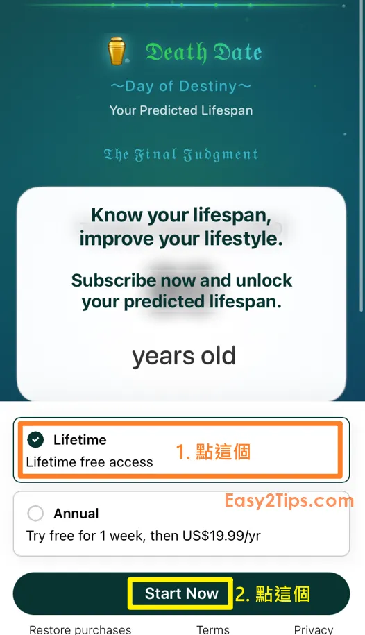 只要下載並打開 App,然後完成一些基本設置及問答 (35題),接著會看到付款選項頁面。如果看到「Lifetime」價格顯示為 $0,點擊此選項並按「Start Now」,透過 Apple ID 認證即可免費獲得。