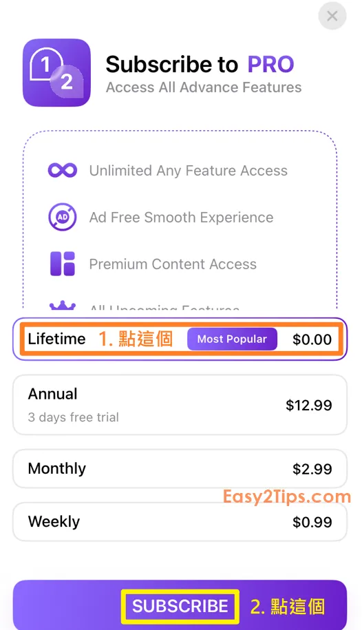 只要下載並打開 App,然後完成一些基本設置後,接著會看到付款選項頁面。如果看到「Lifetime」價格顯示為 $0,點擊此選項並按「SUBSCRIBE」,透過 Apple ID 認證即可免費獲得。