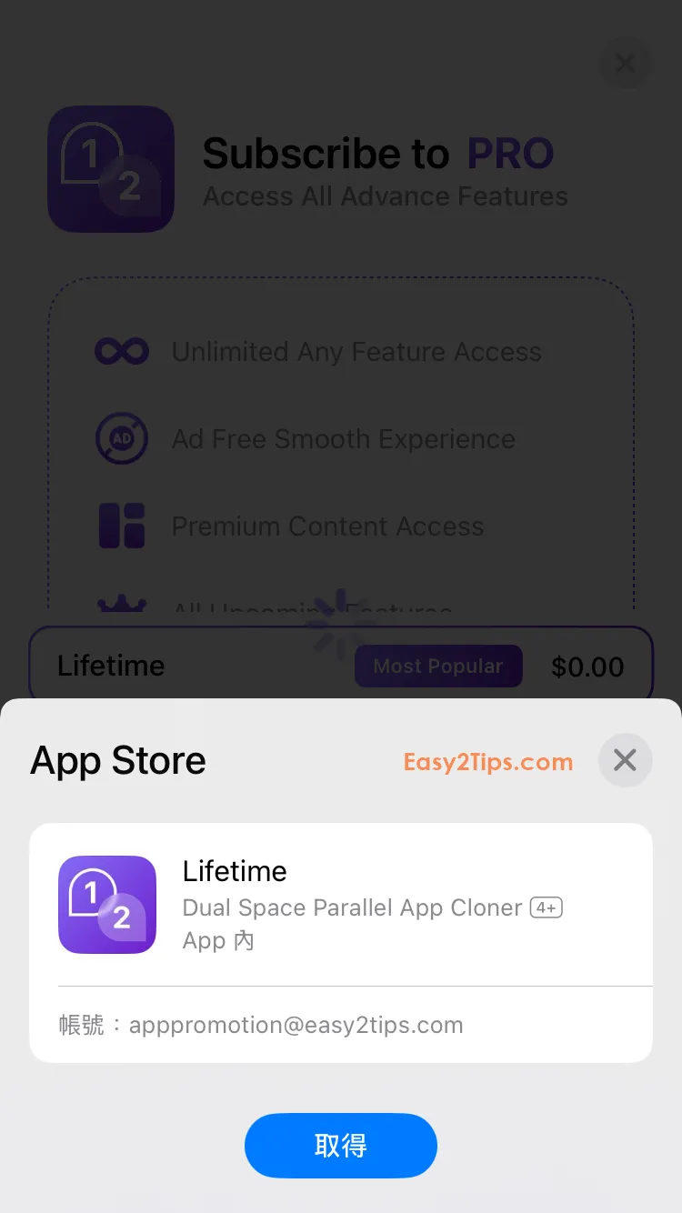 只要下載並打開 App,然後完成一些基本設置後,接著會看到付款選項頁面。如果看到「Lifetime」價格顯示為 $0,點擊此選項並按「GET PRO FOR LIFETIME」,透過 Apple ID 認證即可免費獲得。