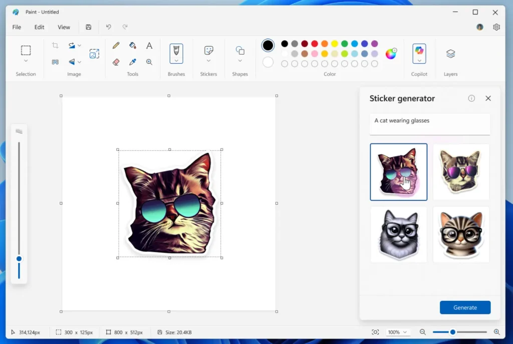 Windows 11 更新同時為 Microsoft Paint(版本 11.2504.451.0)引入兩項 AI 功能:貼圖生成(Sticker Generator)與物件選擇(Object Select)。用戶可透過 Copilot 選單中的「貼圖生成」按鈕,輸入描述(如「戴墨鏡的貓」),生成一組貼圖,隨後可拖曳至畫布、複製到其他應用或儲存以備後用。物件選擇工具利用 AI 智能識別並隔離圖片中的特定元素,免去繁瑣的手動選擇過程。此工具位於工具列,簡化編輯流程,適用於數位創作與影像處理。兩功能均限 Copilot+ PC 且需 Microsoft 帳戶登錄。